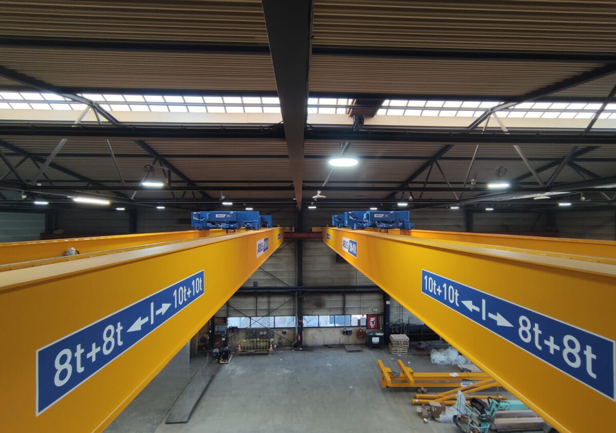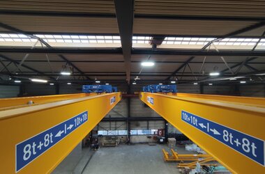 - Dwie suwnice pomostowe dwudźwigarowe wyposażone w podwójne elektryczne wciągarki linowe. Każda wciągarka może podnieść do 10 ton, gdy ładunek znajduje się w środkowej części mostu suwnicy. Ze względu na konstrukcję hali maksymalny udźwig poza oznaczonymi strefami jest ograniczony do 8 ton na wciągarkę. Taka konfiguracja umożliwia bezpieczne przenoszenie zarówno długich, jak i ciężkich elementów, przy jednoczesnym zachowaniu wysokiej elastyczności pracy.